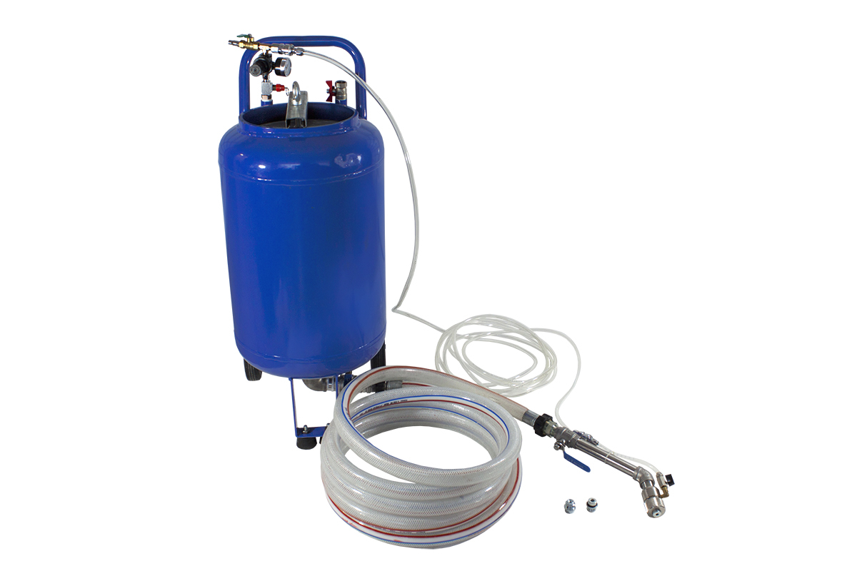 1. Подсоединяют шланги подачи материала от бака к распылителю, шланг подачи сжатого воздуха от бака к распылителю, питающий шланг от компрессора к редуктору бака.