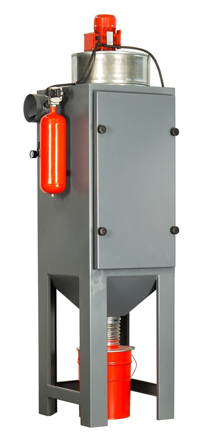 Отработанный воздух, удаленный из рабочей зоны абразивоструйной камеры, проходя через картридж из полиэстера, очищается и выбрасывается обратно в промышленное помещение.